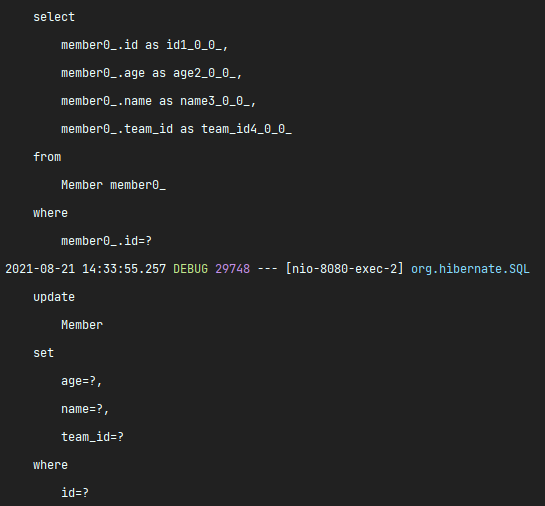 위 코드를 보면 컨트롤러에서 member를 가져와 age를 40으로 바꾸었다. 그리고 트랜잭션이 걸려있는 서비스 계층의 메소드를 호출하게 되면 트랜잭션에서 변경감지가 일어나 update 쿼리가 나가게 된다.